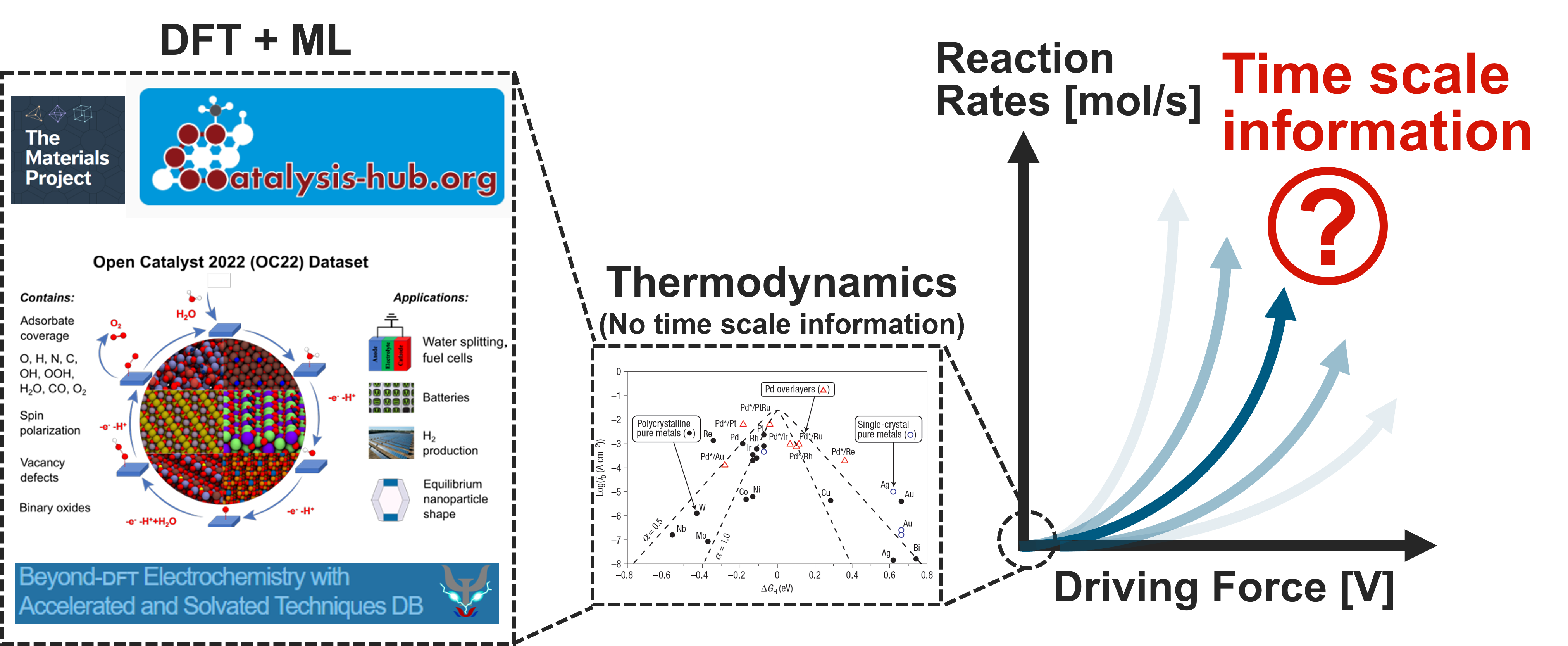 However, this screening is based on thermodynamics, which contains no insight on time scale information. The most important catalytic properties, such as catalytic rates or material lifetime, are fundamentally questions about time scale. This is why we believe that understanding the kinetics of catalytic reactions is important, not only to identify promising candidates, but also to truly understand the behavior of catalysts under real operating conditions. Our research group will pursue this goal via the following three directions.