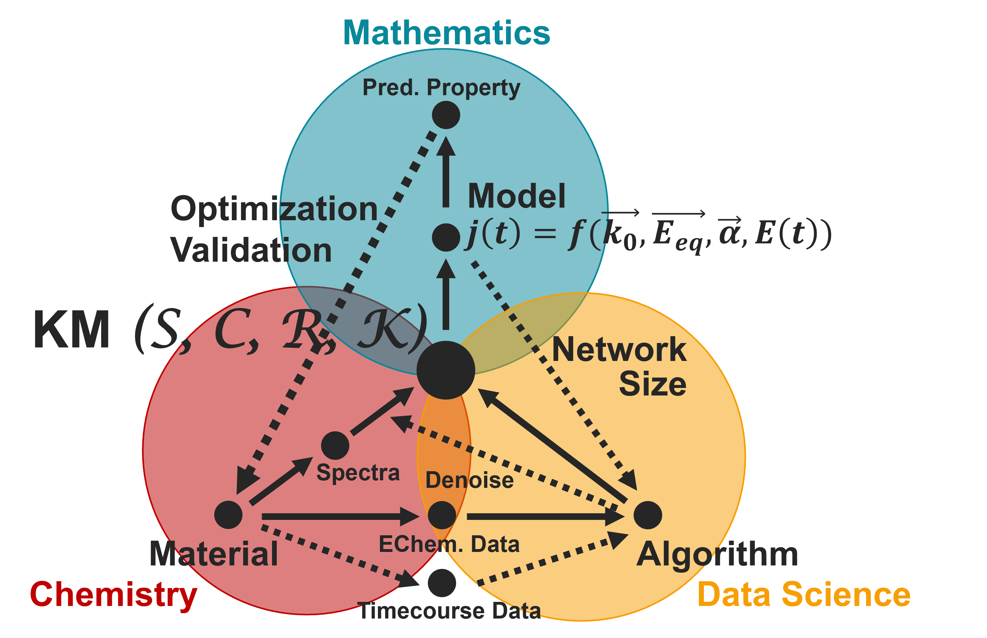 An overview of the work in this group, which bridges applied mathematics, electrochemistry, and data science. KM: Kinetic Mechanism.